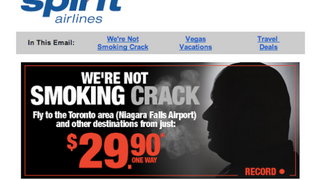 Spirit Airlines, the absolute shittiest airline operating in America, according to me, is marking Toronto Mayor Rob Ford's downward spiral by offering cheap flights to the Toronto area via a special deal. The tagline, from an email blast just sent to customers: "We're not smoking crack." That sure is a cheap flight,…