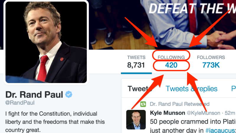 Tip: Rand Paul Follows 420 People on TwitterAshley Feinberg1/19/16 12:00am12019EditPromoteDismissUndismissHideGo to permalinkAt approximately 8:41 p.m. Eastern Standard Time, Gawker received the following tip: