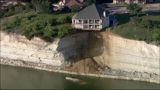 A 7,000-square-foot house overlooking Texas' Lake Whitney had to be abandoned by its owners after its foundation began to crumble off, taking a chunk of the house with it as it fell 75 feet and into the water. The couple that owns the house was forced to move out two weeks ago, after it had been condemned.