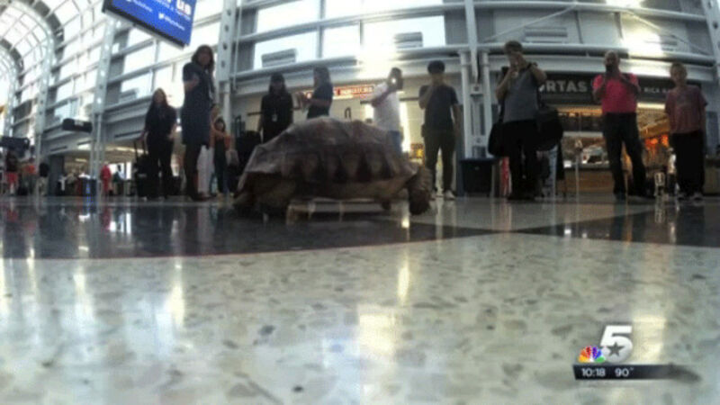 Take one look at the gif above and tell me that seeing a turtle scuttling around wouldn’t improve the experience of being cattle-herded through one of the circles of hell that is a U.S. airport. The answer should be clear to you (it is, “Yes, that would improve my travel experience greatly”), but just in case you’re…