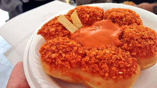 Tim Hortons, the Canadian coffee-and-doughnut restaurant that recently agreed to be bought by America's third-or-fourth-greatest burger chain, Burger King, has revealed their first attempt in assimilating into our brilliant American culture by imagineering the Buffalo Crunch doughnut. Give me a fuckin break!!!