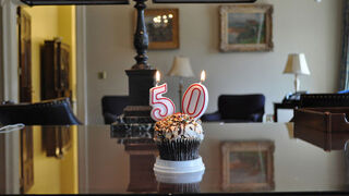 Well, this is somehow fitting. No 2,000-person parties. No Jennifer Hudsons singing "Happy Birthday." No staff cheeseburger outings. No, the other 50th birthday of note in the administration—that of bedraggled Treasury Secretary Tim Geithner—was observed with only a single cupcake, poised on a Starbucks cup, barely…