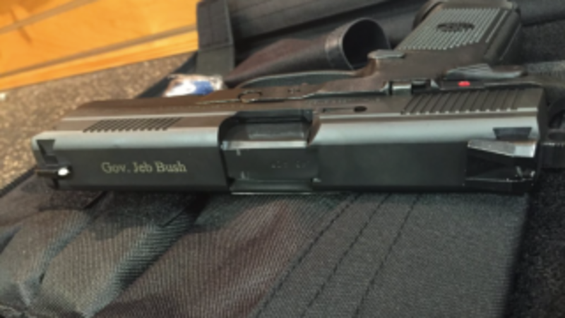 Earlier today, after a campaign stop at the FN America manufacturing plant in Columbia, South Carolina, Jeb Bush tweeted a photograph (caption: “America.”) of a .45-caliber handgun engraved with his name. As it happens, FN America is a subsidiary of the Belgian company FN Herstal, which, the Washington Post points out…