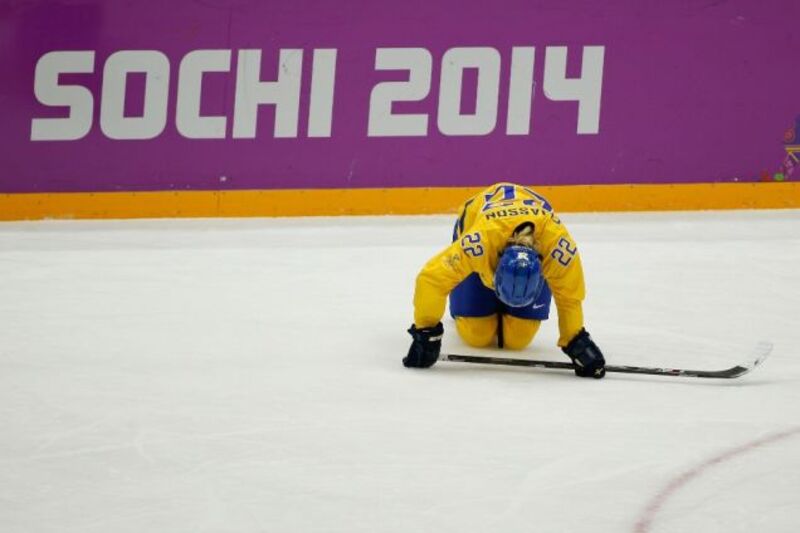 Sarah Hedgecock2/20/14 11:31am19EditPromoteDismissUndismissHideGo to permalink[Emma Eliasson of Sweden kneels on the ice after Team Sweden's 4-3 loss to Switzerland in the women's bronze medal ice hockey game at the 2014 Winter Olympics on Thursday. Image via Julio Cortez/AP.]
