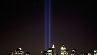 [Lights demarcating where the twin towers of the World Trade Center used to stand glow through the New York skyline in preparation for the ninth anniversary of the Sept. 11th attacks tomorrow. Image via Getty]