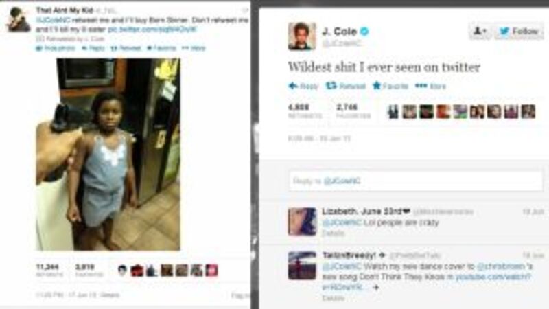 "Retweet me and I’ll buy Born Sinner," said Twitter user That Aint My Kid, referring to Cole's latest album. "Don’t retweet me and I’ll kill my lil sister."