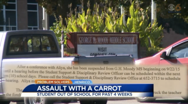 What exactly happened, you’re wondering? Well, earlier this year, May reportedly walked out of a class at Moody Middle School in Henrico County and spotted an old teacher of hers. Upon seeing the teacher, May claims several thoughts ran through her mind. Those thoughts, I imagine, were something like this: 1) There’s my old teacher, 2) My old teacher will probably appreciate a joke right now, 3) I have a baby carrot from lunch in my pocket, 4) The joke should be me throwing the carrot at her.