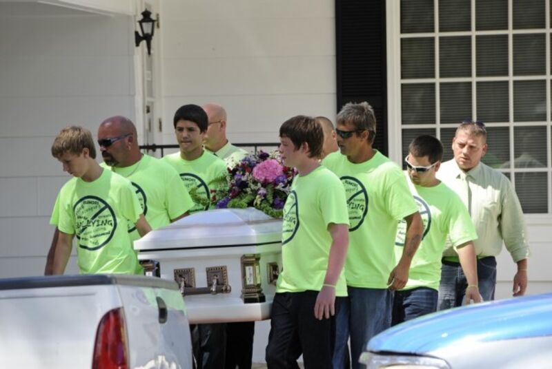 [Image, of pallbearers in anti-bullying shirts carrying Sedwick's casket, via AP]