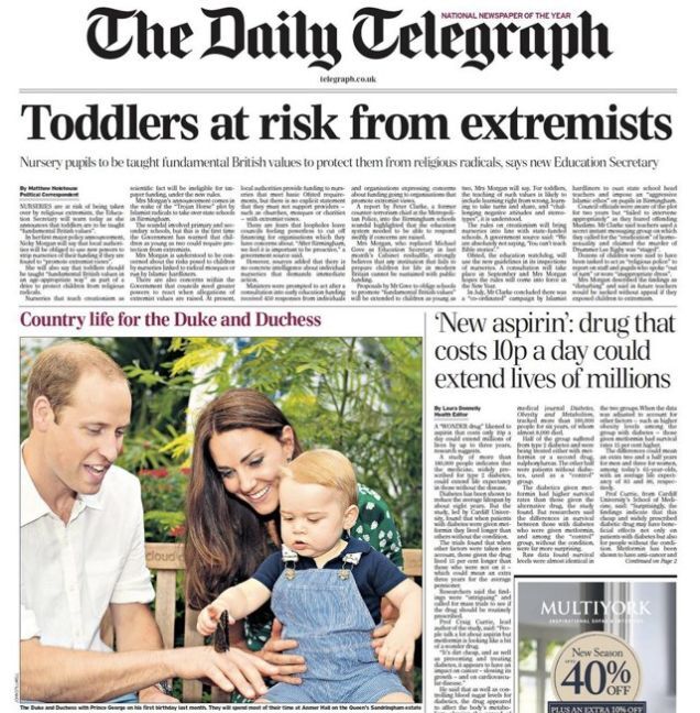 The Daily Telegraph ran a front-page story this morning about England's attempts to teach nursery-school kids "fundamental British values" to protect them from radical indoctrination. After all, you wouldn't want them to end up like the poor baby in the photo, pictured with two dangerous religious extremists.