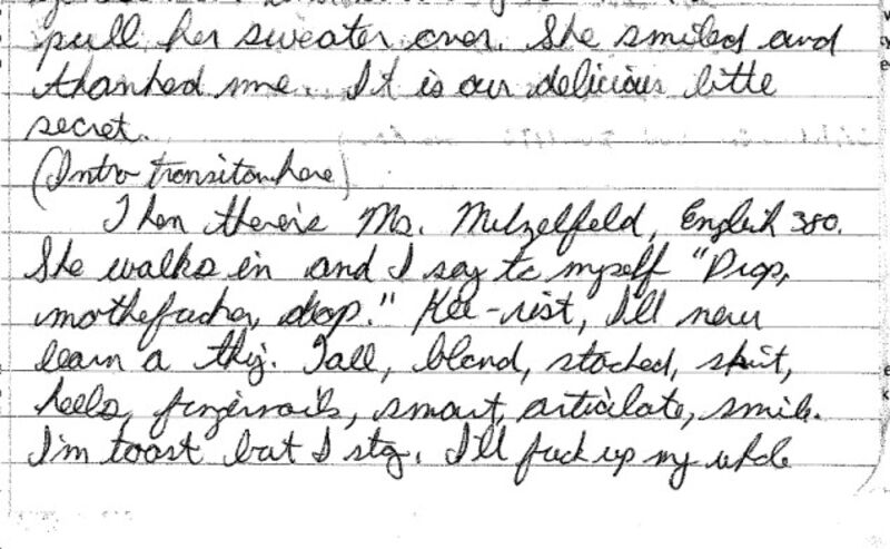Now: before all you PERVERTS start making easy jokes about this, please take the time to look through Corlett's journal. I mean, sure, if it were a dating proposal, it might be construed as somewhat unwelcome, but I would argue that he did, at least, write in the spirit of free self-expression, and not with the primary intent to harass his teacher. Yes, he may have gotten some vicarious thrill from all of this, but he was not just spouting off pornography; he was musing about this and that, and about what was on his mind, and what was on his mind happened to be how he would like to fuck his professor. Polite social conversation? No, but this was an assignment in which creative expression was encouraged. Ask and ye shall receive, academia. Be careful what you ask for.