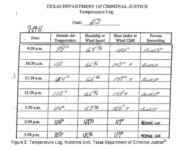 Recent TDCJ temperature logs have recorded heat indices surpassing 100 °F by 8:30 in the morning. Even if the climate remained in this state for the entire day, inmates already would be facing heat indices that the [National Weather Service] has identified as approaching with extreme caution due to an increased likelihood of heat-related injury. In some instances, records also show that air temperatures outside some TDCJ facilities have spiked above 110 °F by 10:30AM, resulting in a heat index exceeeding 149 °F. These temperatures can remain at that level for several hours;22 indeed, investigations into heat-related deaths at TDCJ facilities have found temperatures above 90 °F even past midnight. This heat far exceeds any levels of extreme danger identified by the NWS.