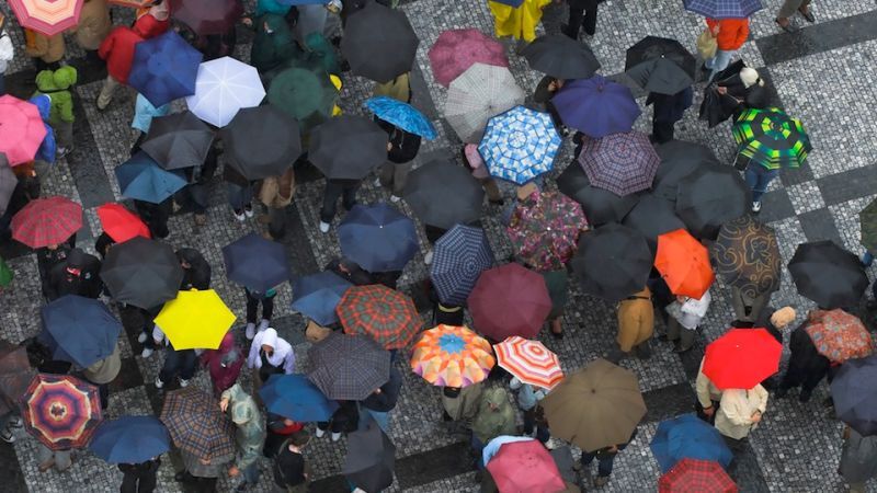 The other long-time enemy of sidewalk traffic is the umbrella. Rather than just paying attention to foot-traffic, there is a large and drippy halo fighting for air space above everyone's heads. Also, sometimes the ribs are spiky and metallic eye-level weapons. Unlike the phone, the umbrella is an arguable necessity in times of precipitation, unless its golf umbrella sized, in which case, take it to a field.