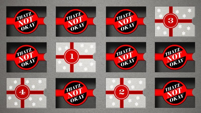 Welcome to The 12 Days of Thatz Not Okay, a special holiday edition of a regular column in which I school inquiring readers on what is and is not okay. Check back tomorrow for our next seasonal installment. As always, please send your questions (max: 200 words) to caity.weaver@gawker.com with the subject "Thatz Not Okay."
