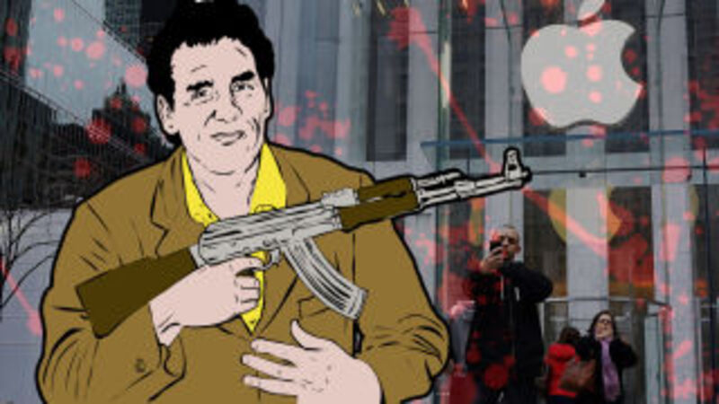 “EVERY BODY GET ON THE FUCKING GROUND!” Kragdar comand with his AK 47 pointed to the heaven’s. Every one the whole store — business men, tourists, staf member's — do what he say. He storm up to the "Genieus Bar" and reach behind it, puling one cowering Apple store employe up by his blue teeshirt with the Apple logo on it. "OPEN UP THE FUCKING CASH REGESTERS, NOW NOW NOW!" He swing over and look at the rest of the staff. "DONT ANY OF YOU GENIEUSES TRY TO BE HERO'S!"