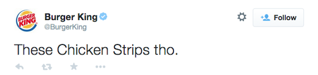 "These Chicken Strips tho," though. A group of people somewhere decided that Burger King should, too, get in on meme Twitter, but as this was run up the flagpole they couldn't get past one tangled knot: Arbitrary Corporate Proper Nouns. So, the result: a billion dollar company using social media to sound like a 19-year-old, but unable to get itself to de-capitalize the phrase "chicken strips."