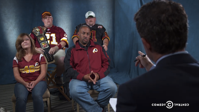 After a long buildup in which Jon Stewart details the minor controversy that followed the taping—including an ineffectual attempt to file a police report by one of the fans—we get to the heart of it. Four Redskins die-hards in one room, eight Native American activists in the other, each group making its case. The Native Americans are right, of course—the Redskins name is baldly racist—and the segment reflects that.