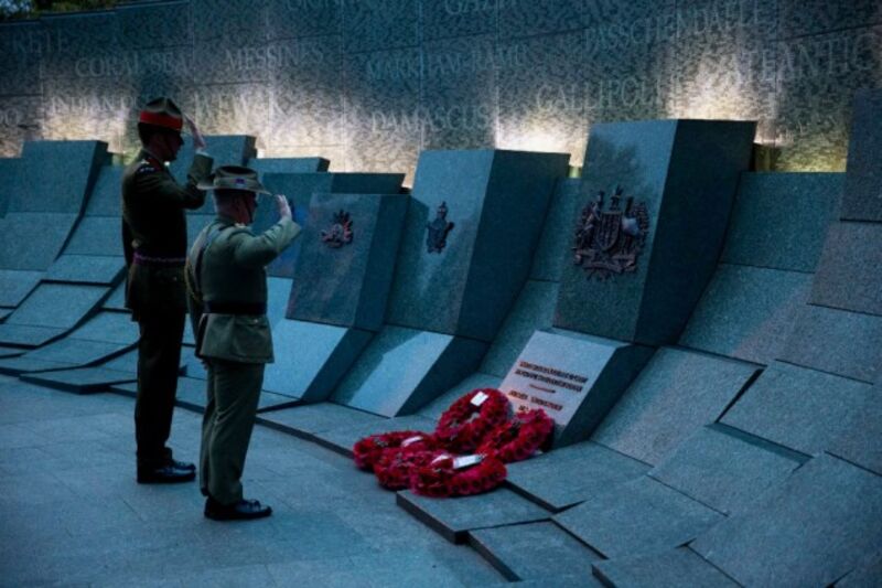 The heads of the New Zealand and Australian Defense Staffs salute after laying wreaths beside the Australian War Memorial during a dawn service to mark Anzac Day in London on Friday. Anzac Day honors the men of the Australia-New Zealand Army Corps who died in the World War I battle for Gallipoli, Turkey. Image via Matt Dunham/AP.