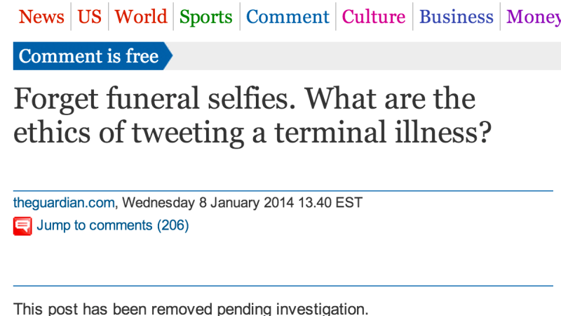 In a lengthy note today explaining why Emma Keller's column on Adams was pulled down from the Guardian's website, readers' editor Chris Elliott states that Adams felt the piece "completely misrepresented the nature of her illness and her reasons for tweeting, was riddled with inaccuracies, and quoted from a private direct message to Keller through Twitter published without permission."