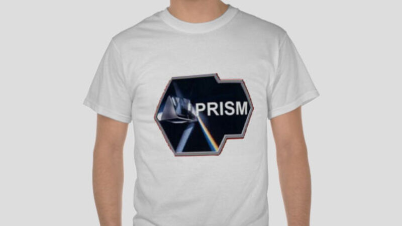 Naturally I turned to apparel. Zazzle.com is a company that allows you to design and sell your own t-shirts and other products. (For examples of the possibilities afforded, see the wonderful Zazzle Poetry.) I grabbed the PRISM logo from The Guardian's website, slapped in on a white tee, and put it up for sale.