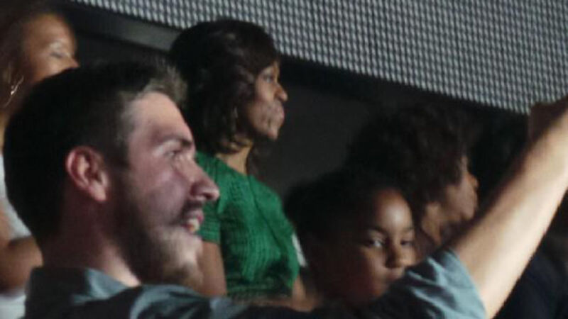 Images snapped by Twitter users show the Obamas (minus the President but plus Gayle King) alternately standing (cool) and sitting (lame, Mom!) in a box surrounded by other concert-goers. Twitter user @YoungCollegiate, who tweeted that he was standing in the row in front of the group, wrote that Malia was "nice" but said she wasn't allowed to take pictures when he asked her for one. (He snapped one on the sly.)