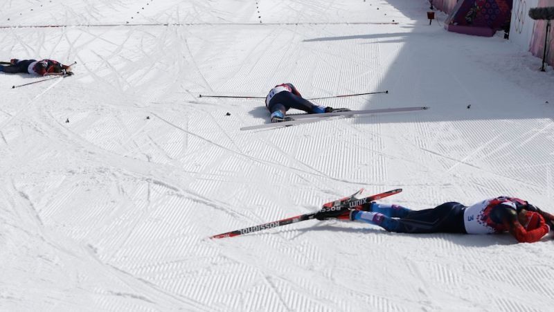 [The gold, silver and bronze medalists relax after the men's 50k cross-country race before the closing ceremonies on Sunday. Image by Matthias Schrader via AP.]