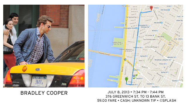 Later that day, at 7:34 p.m., Bradley Cooper caught a cab in Tribeca, outside the Greenwich Hotel, and arrived ten minutes later on Bank Street, just a few blocks north of where Munn had embarked eight hours prior, and paid $9.00 in fare. Both Munn and Cooper paid in cash; it’s unclear how much they tipped.*