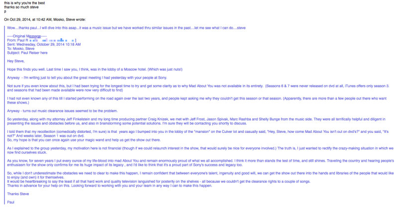 In an email exchange (above, make sure to click "expand") between Sony Pictures Television prez Steve Mosko and Paul Reiser (subject line: "Paul Reiser here"), the latter asks the former what we've all been wondering: why are only some of the seasons of "Mad About You" on iTunes and in stores on DVD?