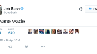Tonight in the first round of the NBA playoffs, the Miami Heat’s Dwyane Wade made several remarkable shots to force a Game 7 against the Charlotte Hornets. Jeb Bush, who has nothing better to do than tweet about basketball like the rest of us, celebrated the heroic performance by mangling the spelling of Wade’s first name in the exact way a small child might.
