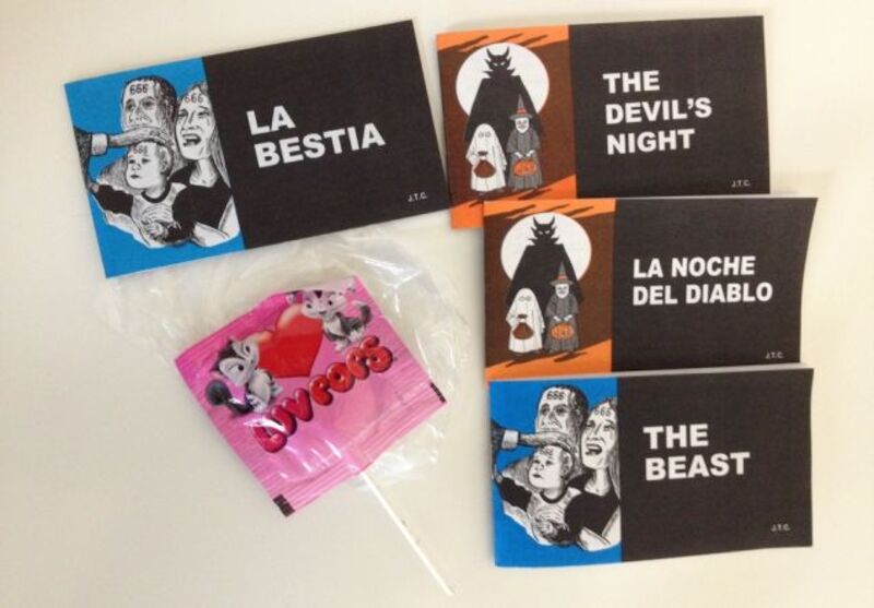 These horrible Fundamentalist Christian comics turned up in my kids' treat bags last night. We've got the English and Spanish editions of The Beast and The Devil's Night, along with an extremely dubious off-brand "Luvpop" all within a factory-sealed plastic bag. What kind of horrible treats were hiding in your bag?