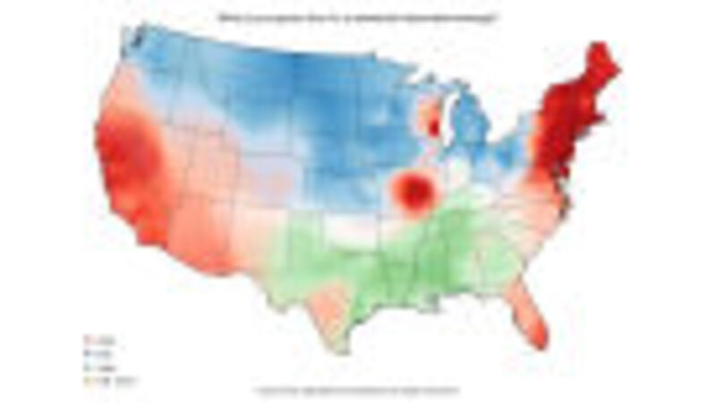 The composite map gives a picture of the overall distribution, coloring each cell according to whichever answer is estimated to be most likely at that location. The more clearly one answer dominates, the darker the color. Individual maps show estimated probability of each particular answer at a given location, with larger probabilities shown in red and smaller probabilities shown in blue. At the moment, only the four most popular answers for each survey question are displayed.