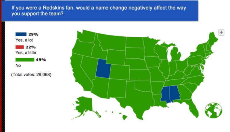 Even an unscientific ESPN poll tells an enduring truth sometimes. Apparently the only places where a majority of hypothetical Washington NFL fans really couldn't brook a hypothetical name change for the team are the deep South and Utah. Maybe that changes if we leave a link to the poll here.