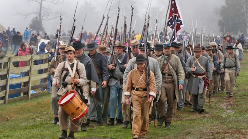 Photo: Confederate reenactors march back to camp after a re-enactment of the Battle of Appomattox Court House as part of the commemoration of the 150th anniversary of the surrender of the Army of Northern Virginia at Appomattox Court House in Appomattox, Va., Thursday, April 9, 2015. The battle was the final battle of the army of Confederate Gen. Robert E. Lee before his surrender to Union troops. Via AP.