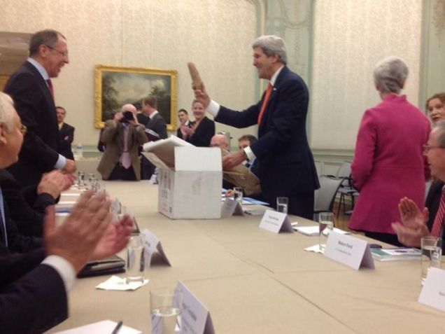 [This photo, from the Facebook account of Russian foreign ministry spokeswoman Maria Zakharova, shows U.S. Secretary of State John Kerry presenting an enormous potato to Russian Foreign Minister Sergey Lavrov.]