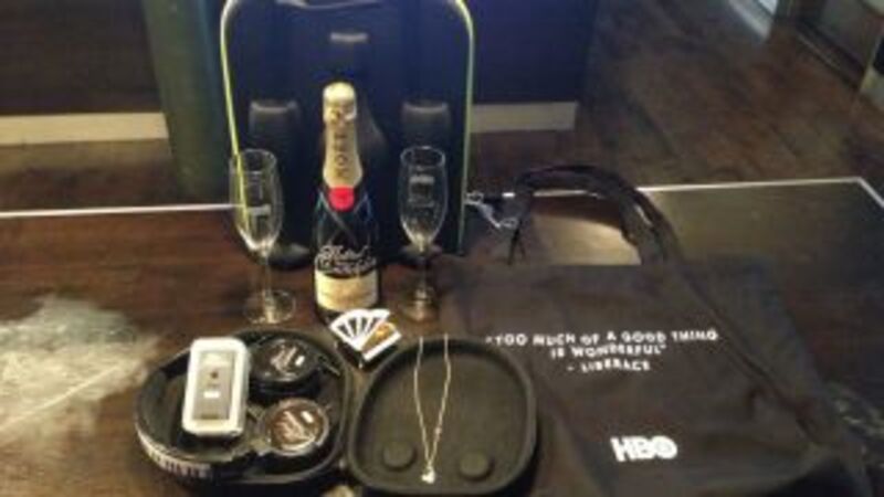 All of this arrived Tuesday in a box so big I thought maybe someone was sending me a suffocated animal. I asked my boss John Cook if I could keep it and he said, "Do you even want it?" An iPod and a bottle of Moët? Yes, that is an instant Friday/living Mariah Carey song. Whatever. I was going to watch Soderberg's Liberace biopic, Behind the Candelabra, anyway (I wanna see Michael Douglas and Matt Damon fuck!). Now I'm gonna watch it in class, like Liberace would if he were alive today and used headphones for the sound on his TV. Anyway, this is the sort of shameless shit that networks do to try to buy positive coverage. We'll see if it works.
