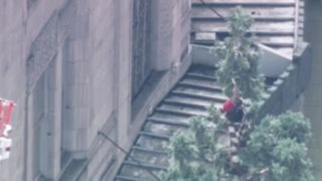 According to KOMO News in Seattle, the above man “has climbed to the top of Seattle’s iconic Sequoia tree, next to the Macy’s store downtown, and apparently is refusing to come down.” He’s also reportedly “flipping the bird” at spectators and throwing apples at nearby law enforcement.