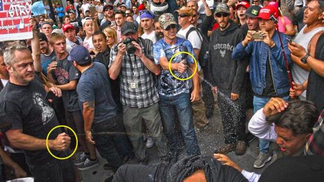 Update: Former Gawker editorial assistant Max Read pointed out that the gentleman in the video above has a tattoo of the number 43, which according to the Anti-Defamation League is commonly received by members of the white supremacist hate group Supreme White Alliance.