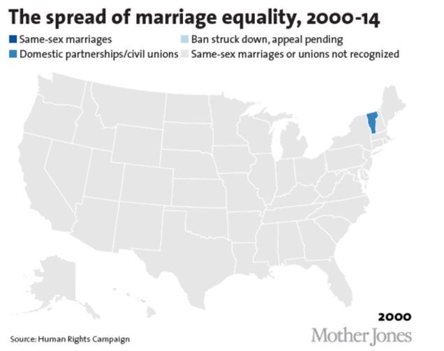 The map above shows the accelerating pace at which new states have begun issuing marriage licenses to same-sex couples or recognizing their relationships as domestic partnerships. As the result of court rulings, legislation, and voter referendums, 21 states and the District of Columbia now recognize some form of same-sex union—and 12 of them joined the pack in the past two years alone.