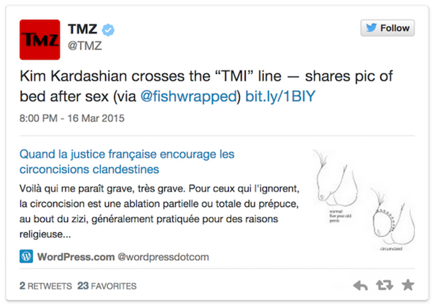 We’re not exactly sure which article TMZ intended to link to, but the link in that tweet leads to a 2009 post on a French-language blog called Pensées d’outre-politique (which means something like: “Thoughts of fringe politics” or “Thoughts from outer politics”). The post is titled “Quand la justice française encourage les circoncisions clandestines” (which means something like: “When French courts encourages secret circumcisions”).