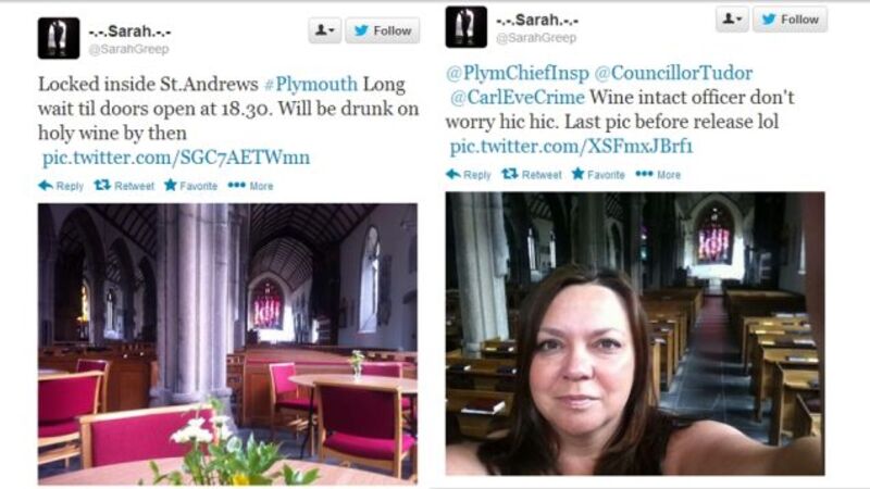 "I'm locked in inside St.Andrews Church!," Greep, of Plymouth, England, tweeted to her followers yesterday morning. "I was in private praying chapel & when I came out, everyone was gone & doors locked."