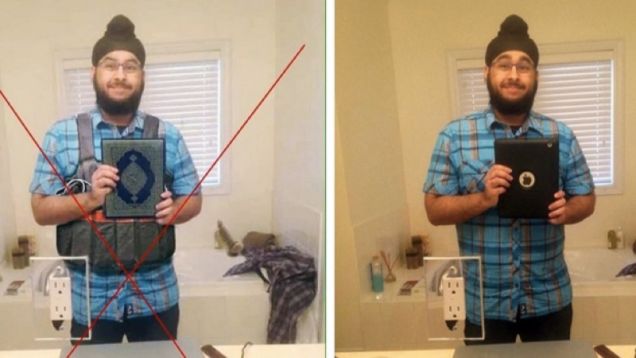 Veerender Jubbal, who describes himself as “a Sikh dude with a turban,” lives near Toronto and says he’s never been to Paris. In the original 2014 photo, he was holding an iPad, but the altered version replaces it with a Qur’an and adds a wired vest over Jubbal’s shirt.