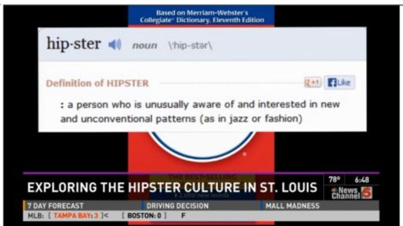 KSDK Channel 5, St. Louis' top source for weather, traffic, and sociocultural investigative reporting, has filed a rather stark and shocking report on "St. Louis Hipster Culture," which, make no mistake, exists. The very first sentence of the story reads, "Hipster, as defined by the Merriam-Webster Dictionary, is..." so you know that KDSK has quite literally "done their homework" on this subcultural topic of importance. In the newscast, this portion of the story is illustrated with a graphic of a Merriam-Webster Dictionary, with the relevant words and definition emerging onto the screen. We encourage you to "fasten your seatbelts" in preparation.