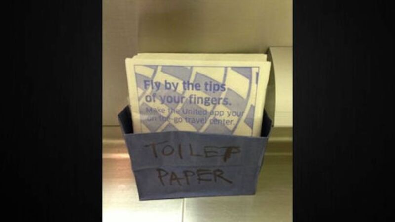 United — which, for some unknown reason, is consistently ranked dead-last among airlines in the American Customer Service Index — casually forgot toilet paper on a 10-hour flight from San Francisco to London. Flight attendants instead stocked the restrooms with cocktail napkins that advised passengers to "Fly By The Tips Of Your Fingers".