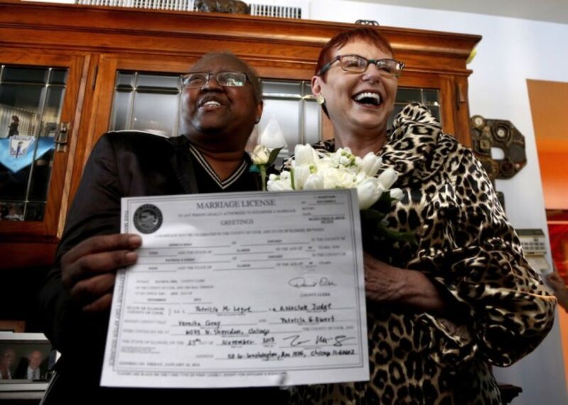 [Vernita Gray, left, and Patricia Ewert hold their Illinois marriage license after they were married in Chicago on Wednesday. While the state's gay marriage law takes effect in June 2014, the couple was granted an expedited marriage license because Gray is terminally ill. Photo by Charles Rex Arbogast via AP]