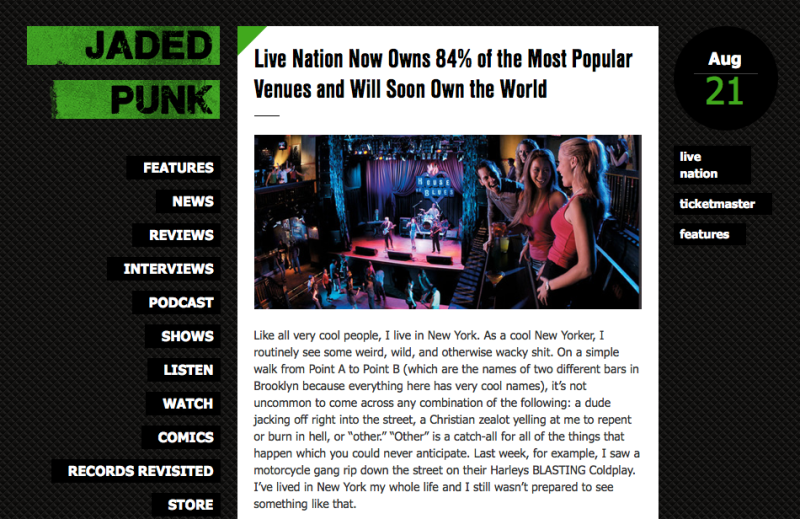 Dan Ozzi is an editor of Noisey, Vice's current music-focused site. Dan Ozzi also runs another music blog on the side called Jaded Punk. A few months ago—before Vice's partnership with Live Nation was announced—Dan Ozzi wrote a blog post about his feelings about Live Nation, which runs a large percentage of the most popular live music clubs in the United States. In the spirit of full transparency to Vice's new business partners, here is the relevant portion, with some helpful bolding by us:
