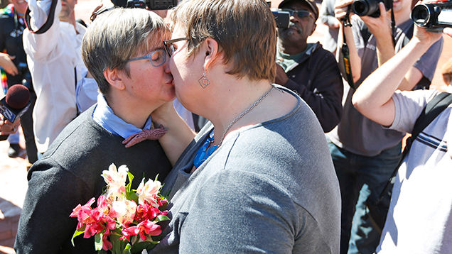 Following this morning's decision by the Supreme Court to deny appeals to seven same-sex marriage cases, couples in Virginia have flocked to state courthouses for impromptu weddings. Yvonne Landis, who with her partner of 23 years, Melodie Mayo, were the first couple in Virginia to apply for a same-sex marriage license today, told the Washington Post, "I'm just really excited. We always said we are waiting for Virginia. We wanted it to be legal here."