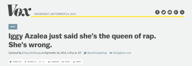 Vox.com, a website run by fans of real rap, lashed out this afternoon against an Iggy Azalea Twitter account that had claimed the whitebread rapper and her gingerbread friend Macklemore were the king and queens of rap. Only problem: the Vox writer believed the account belonged to the real Iggy Azalea.