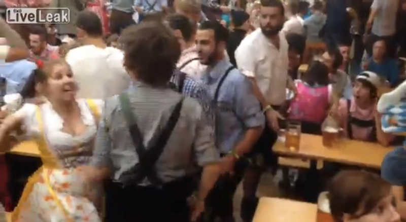The man, dressed in Lederhosen, apparently tried to shove something in a 30-year-old Alaskan woman's mouth. She then got up and punched him, he grabbed her arms, and she bit his lip for at least 15 seconds, when the footage cuts off.