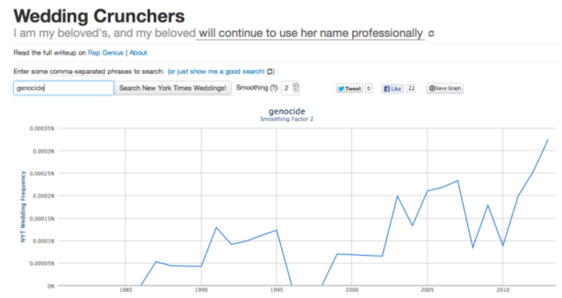 The site was built by the engineering team behind Rap Genius, by plotting "n-gram frequency" in order to "visualize trends across 30+ years of yuppie nuptials." It's like our own dearly departed Altarcations column, except backed the computing power of big data.