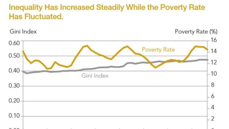 A new study by the Population Reference Bureau examines economic inequality and poverty in the context of American geography—in other words, it looks at where the unequal and poor places are, and where they overlap. What it finds is the convergence of poverty and inequality, a rising tide of economic bad news. Though the poverty rate has fluctuated over the past half century, inequality has been steadily going up—it's risen by about 20% since 1967.