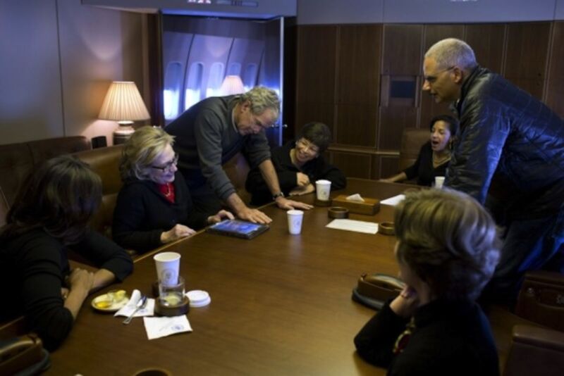 [While traveling on Air Force One to Johannesburg for Nelson Mandela's memorial, George W. Bush shows off his new paintings to Michelle Obama, Hillary Clinton, Valerie Jarrett, Susan Rice, Eric Holder, and Laura Bush. Photo via Pete Souza]